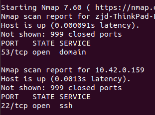 nmap 10.42.0/24可以看到, 当前局域网下共两台设备, 一台是我们的电脑, 一台是树莓派, 树莓派的 IP 地址为 10.42.0.159.