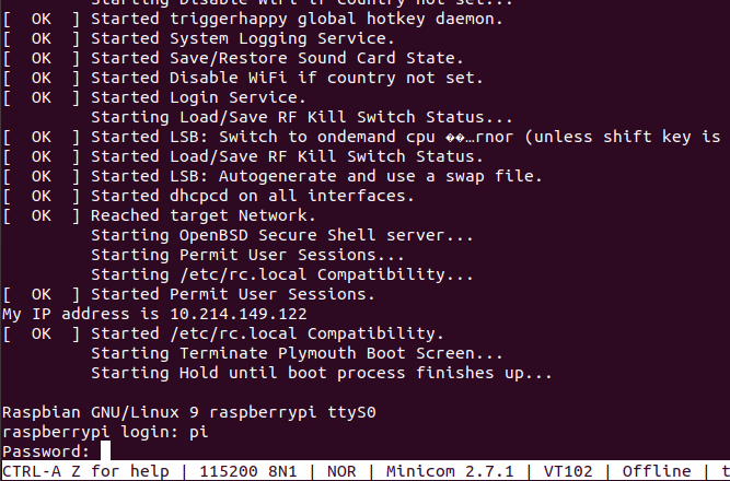 115200 是树莓派串口的默认波特率, /dev/ttyUSB0 对应 USB 转 TTL 模块. 树莓派上电即可自动运行, 此时,会在 minicom 页面看到如下输出. 根据提示, 输入用户名和密码即可登录树莓派. 默认用户名是 pi, 密码是 raspberry.
