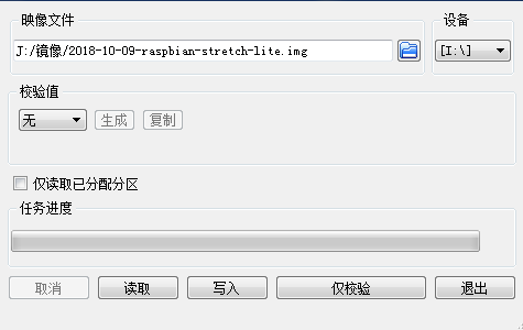 在 Windows 下, 使用 Win32 Disk Imager 工具, 将系统镜像烧录到 SD 卡中. 镜像文件选择 Raspbian Stretch Lite 镜像, 设备选择我们的SD卡对应的盘符. 点击”开始”即可开始烧写过程, 大约2分钟烧写即可完成. (SD 卡有速度等级之分, 运行树莓派系统建议选择级别在 Class 10 及以上的 SD 卡)